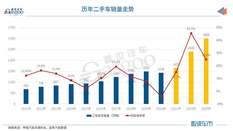 据流通协会副秘书长罗磊预计,2021年二手车交易量会突破1600万辆,有可能在1650-1700万辆这中间,增长率达到15%左右。第二步是在2025年二手车交易量跟新车基本持平,2030年二手车销量争取突破3000万辆,超过新车。可以预见,二手车市场发展还将逐步提速。
