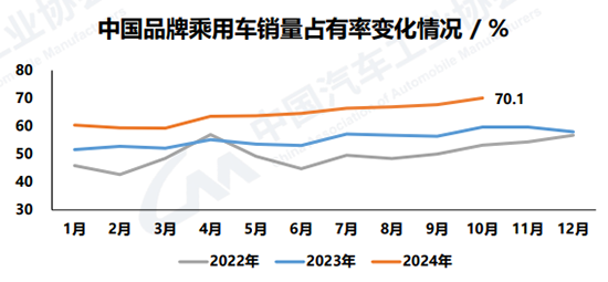 值得一提的是,中国品牌乘用车市场占有率进一步提升,年内首次达到70%以上。10月,中国品牌乘用车销售193.1万辆,同比增长30%,市场占有率达70.1%,较上年同期上升10.4个百分点;1-10月累计销量1384.9万辆,同比增长21.2%,市场占有率为64.6%。