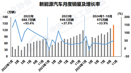 新能源汽车可谓风头正劲。10月,新能源汽车产销分别完成146.3万辆和143万辆,同比分别增长48%和49.6%,产销量创下月度历史新高;1-10月,新能源汽车产销分别完成977.9万辆和975万辆,同比分别增长33%和33.9%,占比汽车总销量的39.6%。