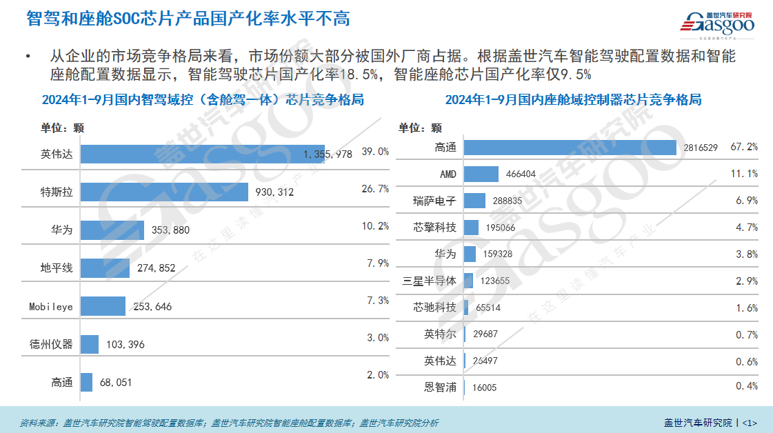 这两大领域车规级芯片的国产化水平仍处于相对较低的状态。根据车域洞察研究院相关数据,智能驾驶域控芯片的国产化率为18.5%,而智能座舱域控芯片的国产化率为9.5%。华为、地平线、芯擎科技、芯驰科技是市场份额较高的本土厂商。