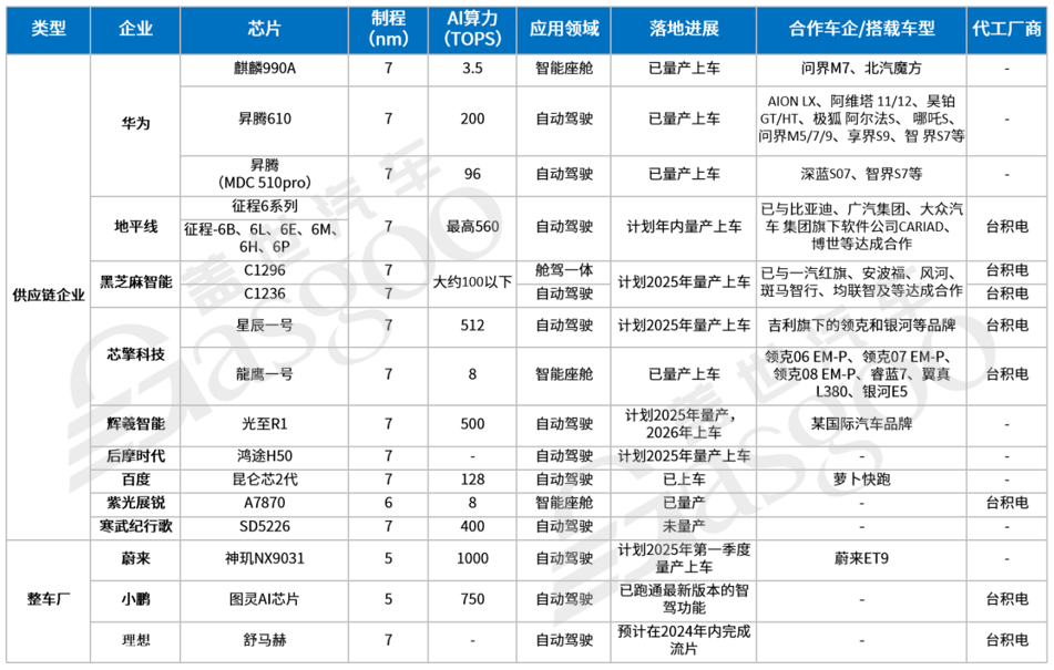 值得注意的是,这些本土厂商所开发的芯片产品中,有不小的部分由台积电代工生产。如地平线在自动驾驶领域的征程6系列芯片,黑芝麻智能在自动驾驶与舱驾一体领域的C1296、C1236芯片,芯擎科技在自动驾驶和智能座舱领域的星辰一号、龍鹰一号芯片,紫光展锐在智能座舱领域的A7870芯片,整车厂小鹏在自动驾驶领域的图灵AI芯片,理想在自动驾驶领域的舒马赫芯片等,均为台积电代工生产。