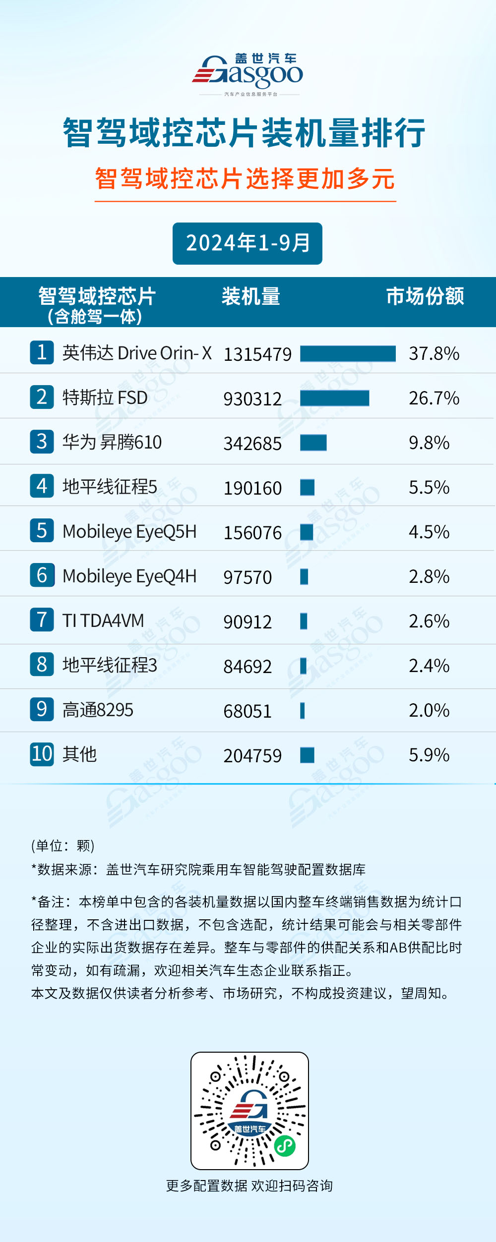 具体而言,今年1-9月,在国内智驾域控芯片领域,华为以10.2%的市场份额占据市场第三位,地平线以7.3%的市场份额占据市场第五位。华为昇腾610、地平线征程5、地平线征程3均在智驾域控芯片装机量排行榜第三、第四和第八位。在国内座舱域控制器芯片领域,芯擎科技以4.7%的市场份额占据市场第四位,华为以3.8%的市场份额占据市场第五位,芯驰科技以1.6%的市场份额占据市场第七位。(点击查看更多供应商装机量排行)