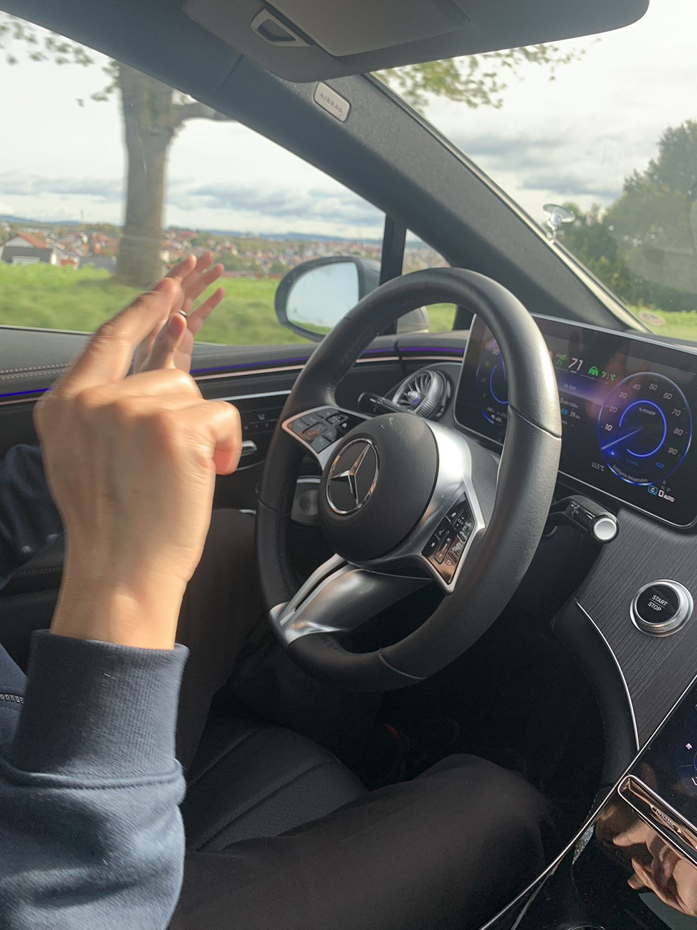在试驾过程中,令作者喜爱的是定速辅助自动驾驶模式:在德国小镇Schwaikheim至Affalterbach的快速车道上,作者开启了定速巡航。双手离开了方向盘,进入“自动驾驶”模式,直线、弯道行驶,完全“自动”,遇到前方有车辆,它会自动减速。很有特色的是,如果前方有环形交通,它识别到环形交通、会自动减速,不过,从哪一个路口开出环形交通,还需作者自己操作。方向盘带有传感器,辅助“自动驾驶”几分钟(?)后,它(车辆)会在组合仪表提示,驾驶员需要重新手握方向盘,提示几次,驾驶员还是没有手握方向盘,它(车辆)会进入紧急模式,自动减速至停下来,以防驾驶员“已经失去知觉、车辆失控”。