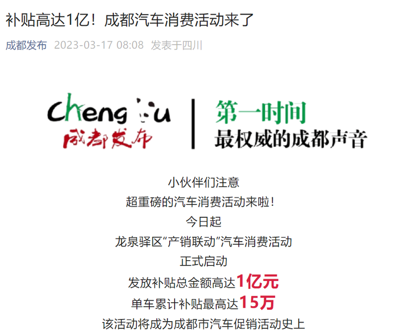 3月17日,成都市龙泉驿区宣布,即日起至2023年6月30日,正式开启“产销联动”汽车消费,发放补贴总金额1亿元,单车累计补贴最高15万。