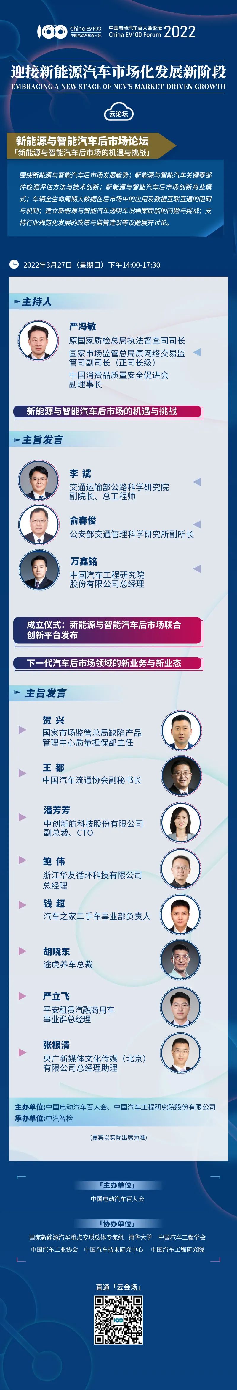 随着智能电动汽车市场规模的不断扩大,相关后市场问题逐渐显现。智能电动汽车后市场论坛将主要围绕:智能电动汽车关键零部件检测评估方法与技术创新;智能电动汽车后市场创新商业模式;车辆全生命周期大数据在后市场中的应用及数据互联互通的阻碍与机制;支持行业规范化发展的政策与监管建议等议题展开讨论。会上还将成立发布“新能源与智能汽车后市场联合创新平台”。