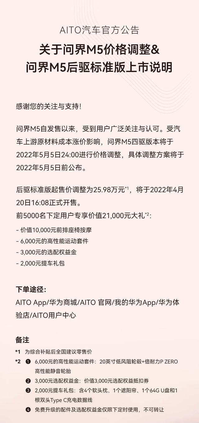 4月20日,AITO汽车官方宣布,受汽车上游原材料成本涨价影响,将对问界M5进行价格调整。其中,问界M5四驱版本将于2022年5月5日24:00进行价格调整,具体调整方案将于5月5日前公布。后驱标准版起售价调整为25.98万元,将于2022年4月20日16:08正式开售。