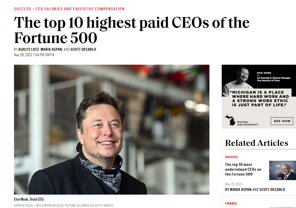 马斯克是2021年《财富》500强企业薪