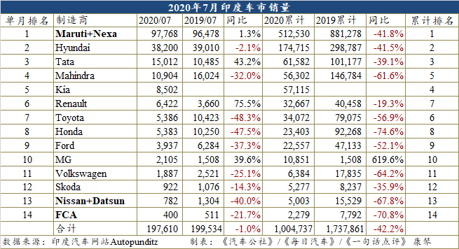综合日前多个印度媒体的报道,7月的数据虽略有不同,如有说197,610辆和197,699辆等,但差异不大,且同期基数皆是199,534辆,是以跌幅均为1%。由于印度汽车网站Autopunditz能提供为更详尽的车型销量,故选用其公布的197,610辆。