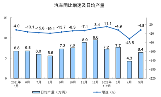 据国家统计局发布数据,5月,全国规模以上(年主营收≥2000万元)工业增加值增速转正,同比微增0.7%,环比增长5.61%,其中,汽车制造业虽同比下降7.0%,但降幅大幅收窄24.8个百分点。1-5月,规模以上工业增加值同比增长3.3%,汽车制造业同比下降5.7%。