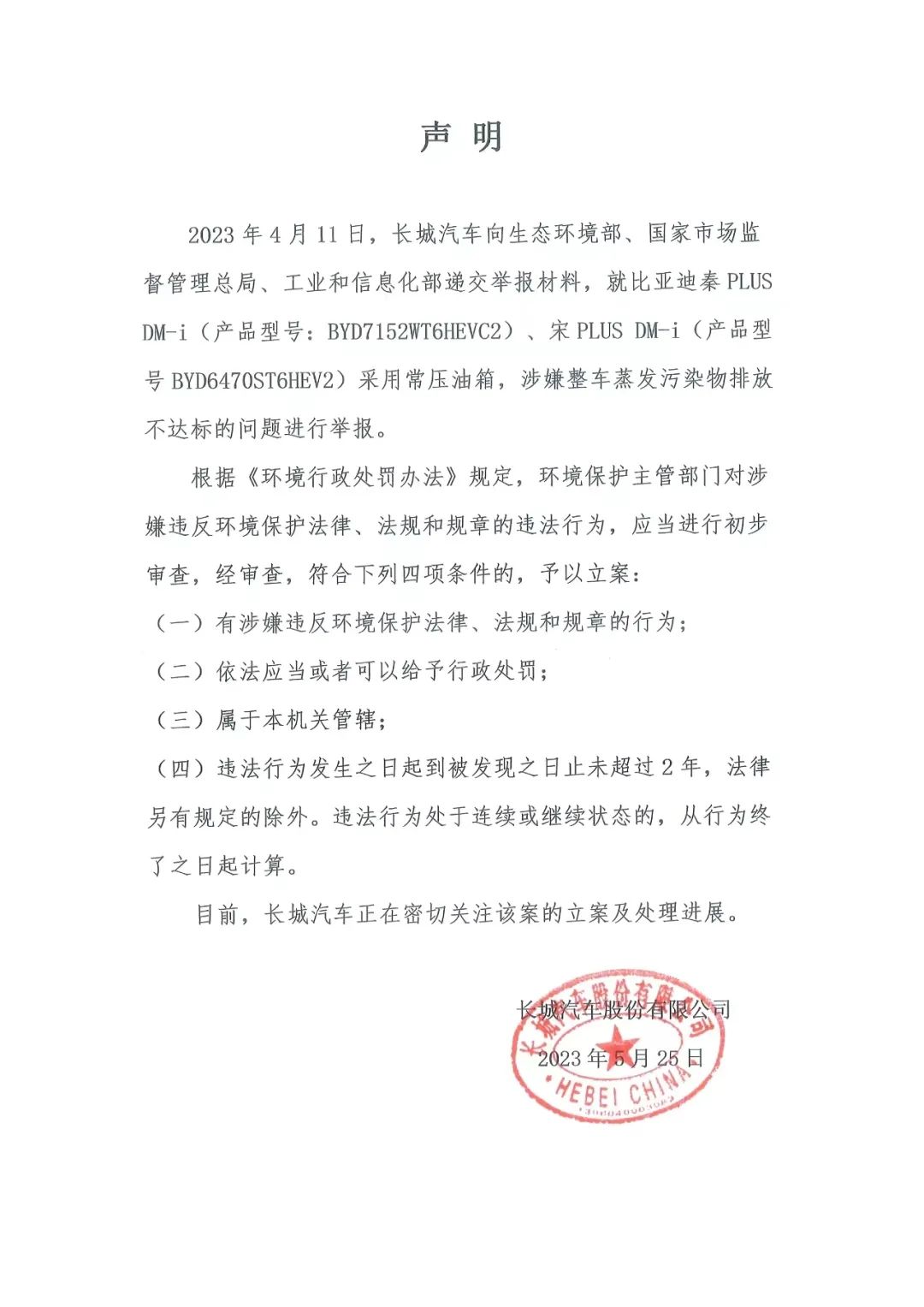 恰逢是在举报车企发布新车型前夕,这个火药味那是十足地浓厚。不少吃瓜群众也明白,长城的这种做法可是在拿出自己的排面去举报,鲜红的公司公章,足以看出这封举报声明的刀光剑影。