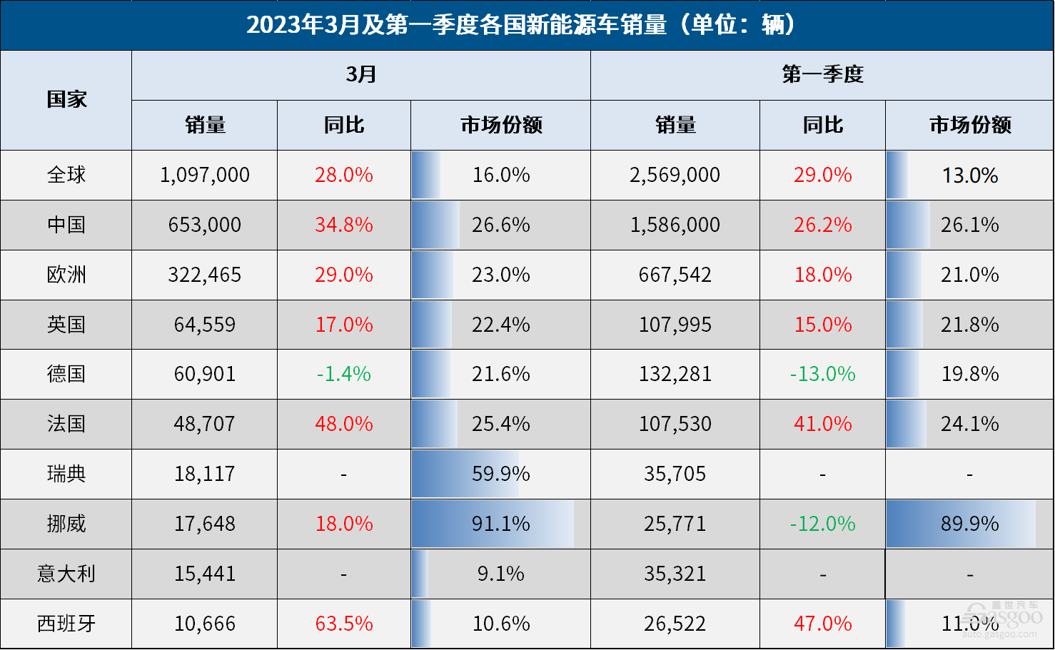 根据CleanTechnia的数据,2023年3月份,全球电动汽车销量约为109.7万辆,同比增长28%,市场份额为16%,是有史以来销量第二好的月份。全球电动汽车市场延续了此前的增长趋势,主要受益于中国和欧洲等主要汽车市场电动汽车销量的稳定增长。