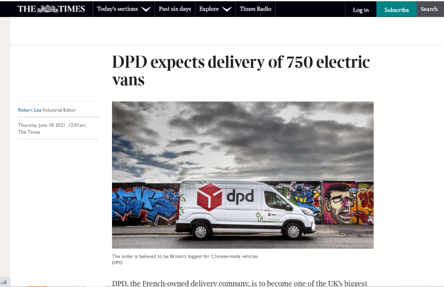 【英国《泰晤士报》报道DPD集团采购上汽大通MAXUS新能源车大单】
