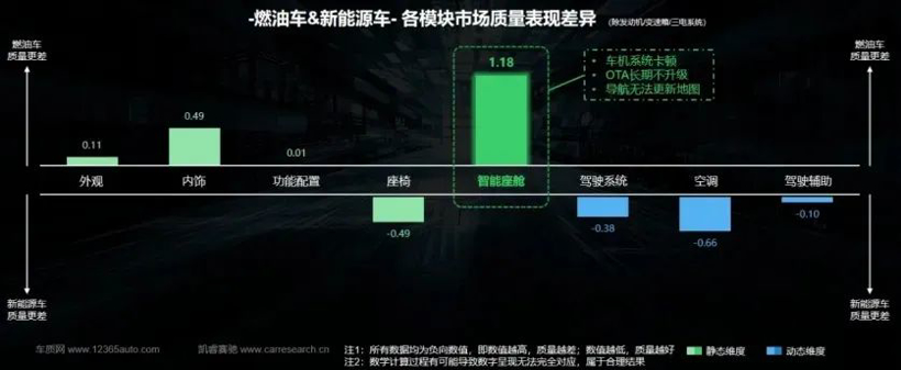 对于燃油车和新能源车质量对比的结果,两者也是背道而驰。AQR结果显示,能源车的整体表现更好,特别是在智能座舱模块,外观、内饰、功能配置的表现也优于燃油车。