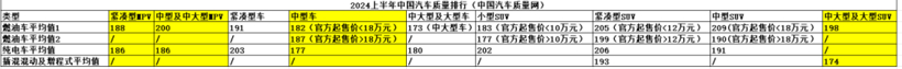 既如此,就需要引入第三个榜单:中国汽车质量网发布的2024上半年中国汽车质量排行。该榜单以平均值的形式对汽车质量进行排行,排除了燃油车庞大的保有量基数可能带来的影响。