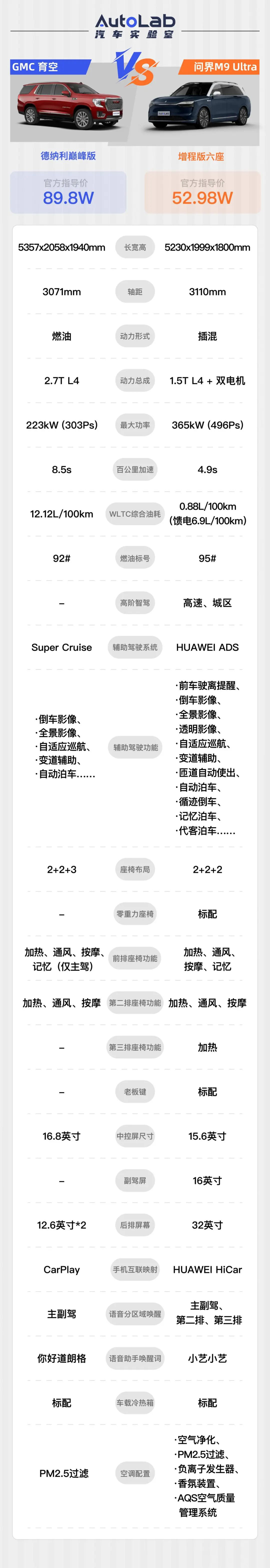 我们选择了育空的德纳利巅峰版和问界M9 Ultra的六座版车型进行对比。