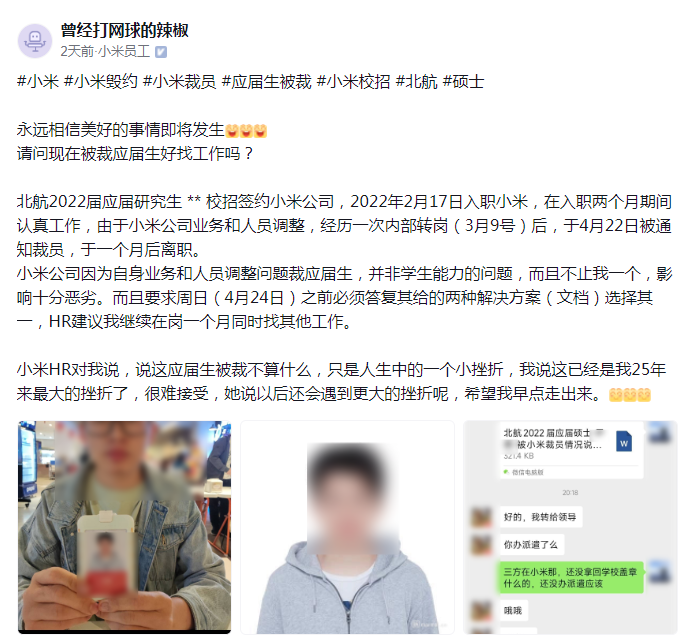 4月22日,用户名为“曾经打网球的辣椒”在脉脉社区发帖,讲述身为北京航空航天大学应届毕业生,校招入职小米两个月后被裁的遭遇。其2月17日入职,3月9日经历内部转岗。4月22日被通知裁员后,HR建议他留岗一个月,同时找其他工作。