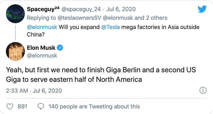 当在Twitter上被问及特斯拉是否计划“在中国以外的亚洲地区建设超级工厂”时,马斯克给出了肯定的回答,但是他同时指出,特斯拉当前的首要任务是完成柏林超级工厂的建设工作。此外,特斯拉还要在美国再建一座超级工厂,从而“为北美东半部市场服务”。