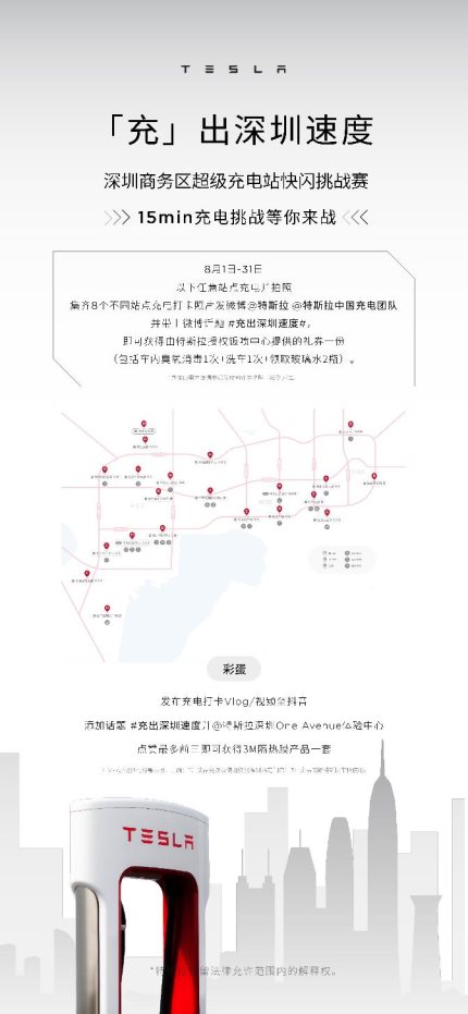 同时,为了让车主更好地体验到深圳商务区区域的超快充电补能服务,此次第900座超级充电站落成仪式也同步开启了“‘充’出深圳速度——深圳商务区超级充电站快闪挑战赛”,特斯拉车主根据发布的超级充电站地图,前往商务区区域(包括南山区、福田区、罗湖区)任意超级充电站打卡,拍摄车辆在充电时的照片,通过微博@“特斯拉”和“特斯拉中国充电团队”官微号,并带上#充出深圳速度# 的话题,集满至少 8 个站点的微博打卡即可获得全车免费养护体验。